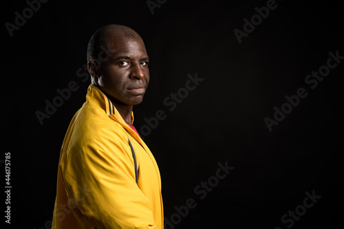 concentrating, serious, horizontal, half face, african american, black background, standing, strong, muscle, male, body, masculine, professional, alone, attitude, expression, posing, studio, portrait, dark, lifestyle, dark background, black, closeup, jacket, t-shirt, red, yellow, bald, confident, stylish, face, performance, posture, thought, concept, authentic, style, perspective, waist up, pensive, thinking, real, dangerous, stern, solemn