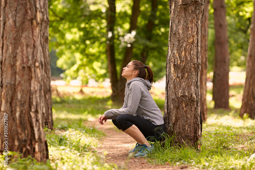 Side view of beautiful caucasian brunette with ponytail and in sportswear crouching in woods and resting after running.