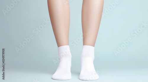Side view of beautiful smooth female legs in short white cotton socks on a plain background on tiptoes. Mock up blank clothing template