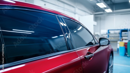 Side view of car window tint, ceramic film provides heat rejection and UV protection with stable color, car film installed on the glass surface of the , selected focus car tinting service