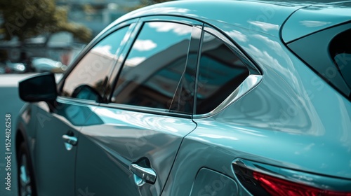 Side view of car window tint, ceramic film provides heat rejection and UV protection with stable color, car film installed on the glass surface of the , selected focus car tinting service