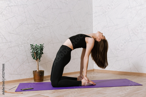Side view of flexible tranquil woman in black top and leggings doing backbend and showing Camel pose while doing yoga on mat at home