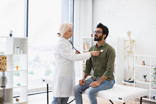 Side view of focused elderly lady in white coat using stethoscope while young man sitting on exam couch. General practitioner examining heartbeat while providing regular checkup in clinic.