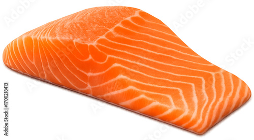Side view of fresh raw salmon fillet, vibrant orange color, smooth texture, white marbling, isolated on transparent background