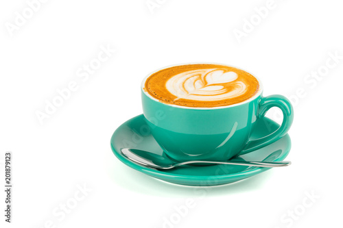 Side view of hot latte coffee with latte art in a green cup and saucer isolated on white background with clipping path inside.
