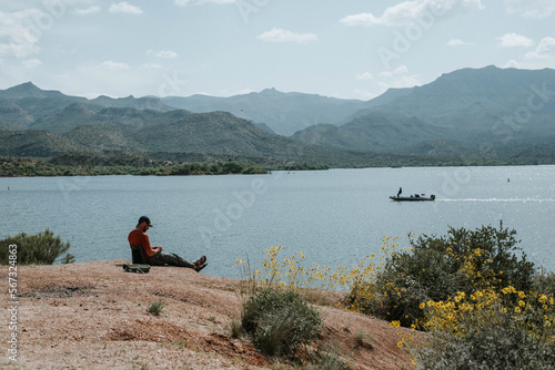 man, lakeshore, mountain, lake, lifestyle, plant, sitting, half face, relaxation, sunlight, water, growth, scenic, remote, environment, nature, vacation, avocation, full-length, destination, us, arizona, outdoors, day, one person, male
