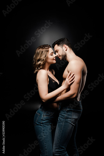 side view of sexy shirtless man and beautiful girl in bra hugging on black background