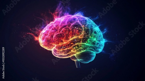 Side view of the brain with hacker neural activity, colorful smoke, and electronic circuits on a black background