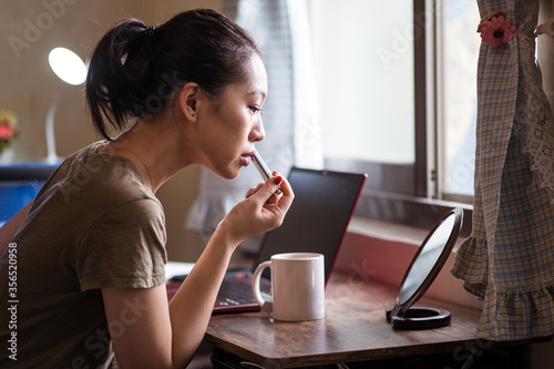 woman, lipstick, paint, apply, mirror, lip, casual attire, cosmetic, young, serious, female, ethnic, asian, apparel, style, t-shirt, outfit, wear, to sit, wooden, table, desk, lady, make-up, visage, sharpened, condensed, beauty, cosmetology, charming, prepare, work, morning, home, living room, cosy, interior, flat, apartment, feminine, appearance, daily, routine, half face, indoor, blurred background, copy space