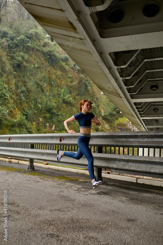 Side view on Young woman running on bridge in nature running for exercise. fitness, sport, people, exercising ,running and lifestyle. Side view portrait, copy space. Redhead lady in sportswear