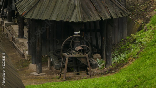 aged, house, wood, architecture, wooden, farm, countryside, rural, wheel, nature, tree, hut, country, vintage, grass, forest, barn, roof, cart, machine, museum, historical building, cut, harvest