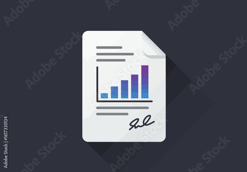 Signed business document with a financial growth bar chart. Flat design vector illustration of a successful report, data analysis, and agreement.