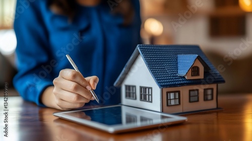 Signing for a New Home: Real Estate Contract on Tablet with Model House