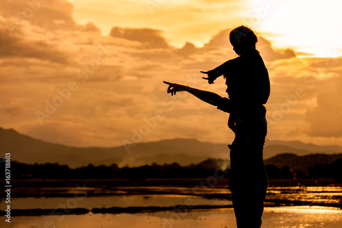 Silhouette asian little girl riding on father's shoulder and playing together with sky and cloudy in the cornfield at sunset