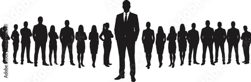 Silhouette business team standing confidently together, leadership concept, professional workforce unity, corporate collaboration, office attire, successful management, vector illustration