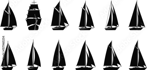 Silhouette collection of different sailing boats, vintage and modern yachts, isolated on white background, nautical transport, black and white clipart