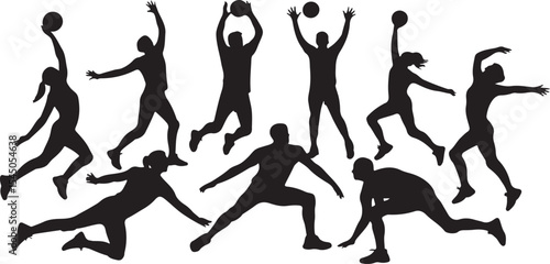 volleyball, player, silhouette, action, sport, game, athletic, competition, team, movement, jump, serve, spike, set, dig, block, active, energy, dynamic, fitness, sporting, exercise, black-and-white, vector, illustration, graphic, design element, isolated, background, white background