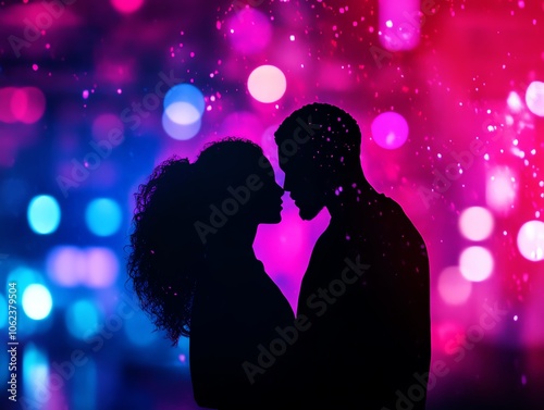 Silhouette couple in romantic embrace with colorful bokeh background.