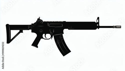 silhouette, rifle, weapon, firearm, military, assault, gun, black, dark, arm, design, detail, modern, automatic, tactical, part, component, feature, profile, side, view, shooting, hardware, metal, grey, outline, graphic, illustration, drawing, simple, image, single, isolated, background, compact, portable, loading