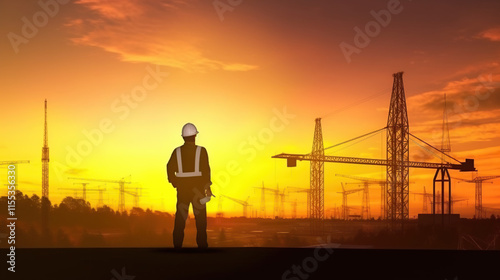 silhouette, engineer, standing, order, construction, men at work, sunset, crane, sky, orange, yellow, industry, building, project, architect, hard hat, safety, vest, background, landscape, horizon, metal, image, illustration, photo, wallpaper, structure, tower, machinery, tool, equipment, job, labor, trade, man, looking, distant, field, ground, shadow, contrast, skyline, development, architecture, site, urban, infrastructure, heavy, steel