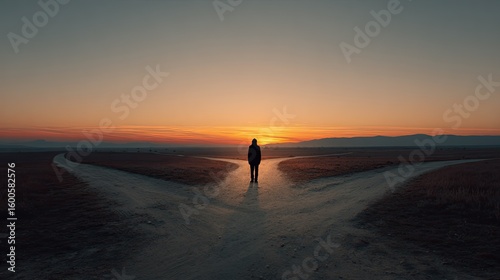 silhouette, figure, crossroad, sunrise, sunset, dawn, dusk, path, choice, decision, contemplation, future, journey, hope, light, shadow, horizon, sky, orange, yellow, red, landscape, rural, empty, still, moment, calm, serene, alone, individual, thoughtful, consideration, uncertainty, possibility, dilemma, option, road, grass, dry, land, exterior, nature