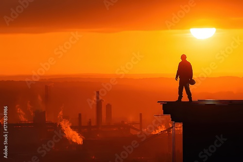 Silhouette Figure On Rooftop At Sunset Over Industrial Cityscape