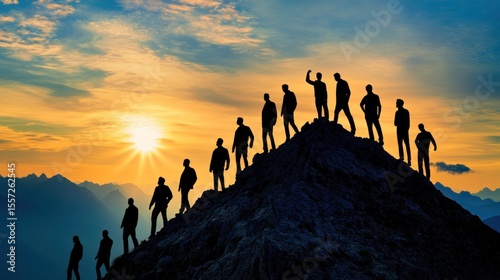 silhouette, figure, mountain, sunrise, climb, summit, people, hiking, adventure, peak, cloud, sky, sun, light, gold, colours, landscape, nature, outdoors, reaching, success, aspiration, growth, teamwork, progress, effort, challenge, inspiration, determination, achievement, hope, journey, triumph, exertion, motion, perspective, elevation, silhouette, strong, vision, triumphant, endurance, conquest, rising, up high, together