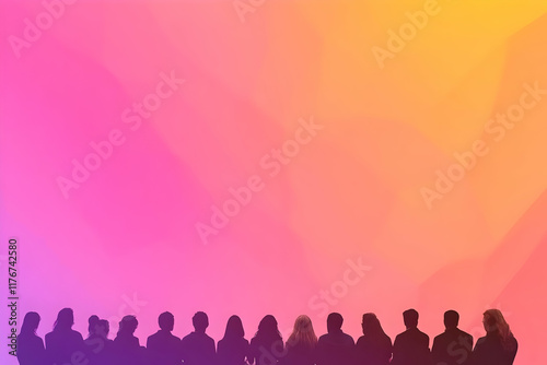 silhouette, group, people, abstract, background, colourful, gradient, pink, orange, yellow, design, illustration, vibrant, texture, modern, contemporary, art, image, graphic, wallpaper, pattern, style, visual, aesthetic, digital, artwork, abstract art, sunset, sunrise, calm, peaceful, audience, meeting, togetherness, community, oneness, harmony, corporate, teamwork, collaboration, event, presentation, spectator