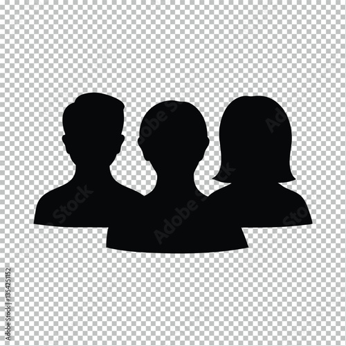silhouette, group of three people, black shapes, transparent background, profile view, minimalist design, icon style, simple graphic, team concept, social network symbol, user avatars