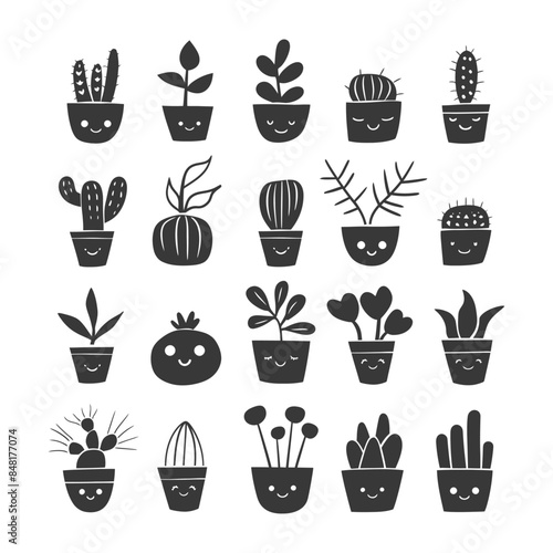 silhouette, hand, drawn, cute, plant, doodle, collection, set, art, bw, design