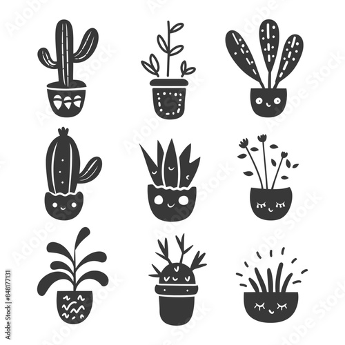 silhouette, hand, drawn, cute, plant, doodle, collection, set, art, bw, design
