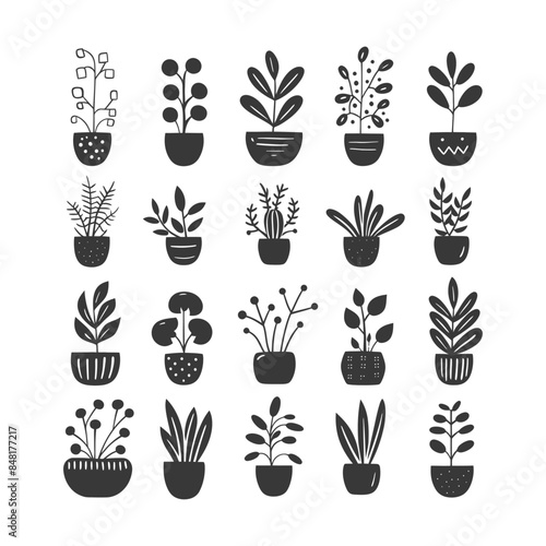 silhouette, hand, drawn, cute, plant, doodle, collection, set, art, bw, design