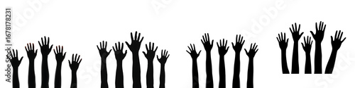 hand, silhouette, group, team, community, crowd, support, agreements, cooperation, volunteer, voting, success, achievement, celebration, reaching, reaching up, together, black-and-white, isolated, white background, participation, concept, abstract, illustration, graphic, design element, business, education, communication, diversity, equality, inclusion, democracy, power, social, hope, future
