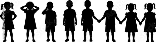 Silhouette illustration of boys and girls, children holding hands, vector kids clipart, black children figures for educational design, child pose bundle, school project graphics pack