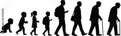 Silhouette illustration showing human life cycle from baby crawling to elderly with cane, growth stages, aging process, family evolution concept