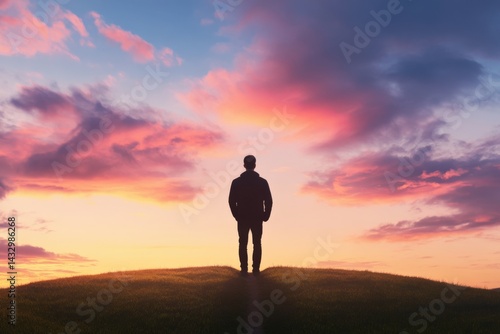 silhouette, man, sunset, sky, hill, person, back, alone, landscape, cloud, contemplation, sun, freedom, hope, motivation, dream, travel, nature, peace, spiritual, evening, path, scene, view, thoughtful, walking, inspiration, horizon, grass, serene, tranquil