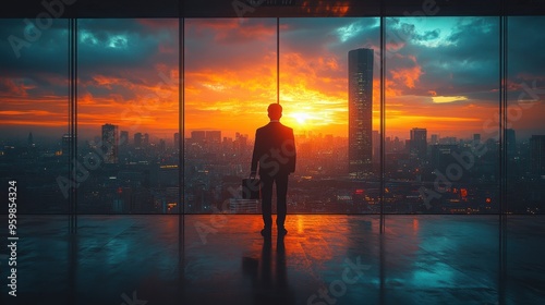 silhouette, businessman, sunset, city landscape, window, building, skyscraper, city, office, urban, view, horizon, sky, cloud, glasses, gold, hours, twilight, evening, night, landscape, corporate, success, business, achievement, dream, ambition, opportunity, future, inspiration, motivation, outlook, optimism, goal, perspective, work, career, professional, modern, contemporary