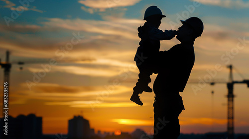 silhouette, construction, men at work, children, sunset, crane, sky, evening, family, bond, hard hat, safety, skyline, urban, city landscape, outdoors, building, industry, affection, care, togetherness, labor, shadow, dusk, construction site, background, horizon, scaffolding, love, architecture