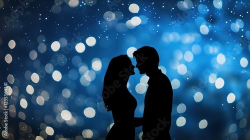 Silhouette of a Couple Embracing Against a Glittering Blue Background
