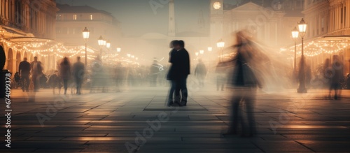 Silhouette of a couple in love against the backdrop of the bustle of the city. Long exposure. Motion blur. Relationship.