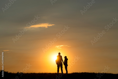 sunset, connection, beautiful, love, romantic, happiness, gold, affection, couple, closeness, horizontal, outdoors, dusk, evening, silhouette, peace, sunburst, landmark, illumination, backlit, romance, adventure, togetherness, watching, expression, wife, husband, boyfriend, girlfriend, standing, enjoyment, viewing, half face, holding hands, having fun, two people, copy space, full-length, get-away, profile, rural, national park, color image, national landmark