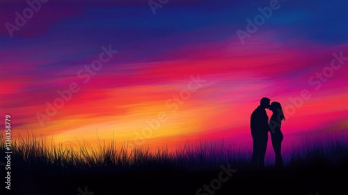 Silhouette of a couple sharing a kiss against a colourful sunset, with copy space