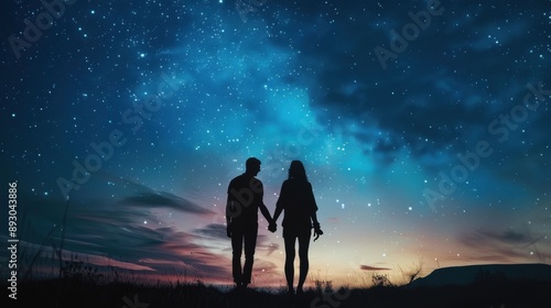 Silhouette of a couple standing hand in hand under a night sky glowing with galaxy light, representing love and infinity