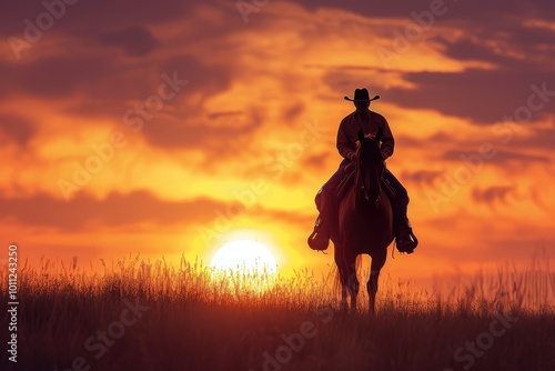 Silhouette of a Cowboy Riding a Horse at Sunset in the Open Plains, AI Generation