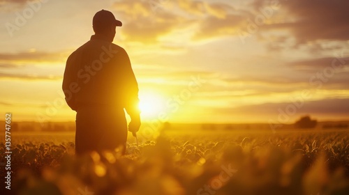 Silhouette of a farmer in a vast field at sunrise with golden light illuminating the horizon Generative AI
