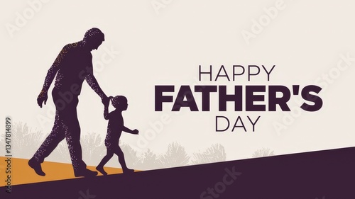 Silhouette of a father holding hands with his child walking on a hill with text Happy Father's Day on a beige background