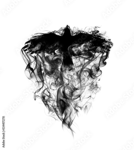 Silhouette of a flying raven with spread wings in beautiful puffs of black smoke isolated on a white background. Silhouette of a flying raven in clouds of smoke.