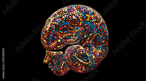 Silhouette of a gear with a brain shape inside, made of glowing, multicolored dots, resembling stars. The vibrant particles represent intelligence, technology, and the mechanics of AI innovation.