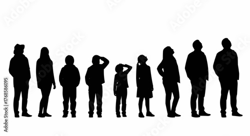 silhouette, people, group, standing, line, looking, up, sky, up high, person, children, adult, woman, man, hat, hair, head, body, leg, foot, clothing, jacket, pant, dress, shadow, shape, figure, outline, form, stature, posture, gaze, view, sight, direction, upward, together, crowd, gathering, observation, interest, curiosity, wonder, surprise, attention, sharpened, viewing, watching, looking up
