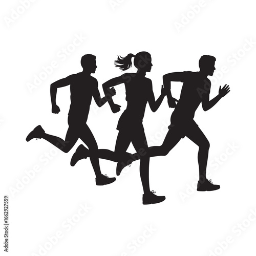 running, runner, silhouette, marathon, jogging, sport, fitness, exercise, group, people, man, woman, active, lifestyle, healthy, cardio, training, physical exercise, race, competition, isolated, black, vector, trio, team, wellness, endurance, athlete, sprint, jogger, park, movement, graphic, design, illustration, element, symbol, teamwork, friendship, health